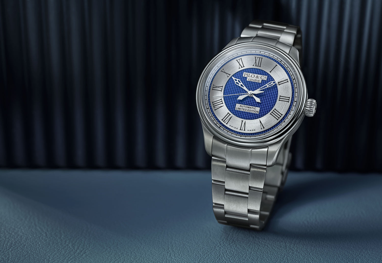 La firma de la marca "Pilo & Co Genève" y las etiquetas "Edición Limitada Automática" se presentan en forma de dos placas en miniatura que adornan la superficie más interna de la esfera. Se destacan por la decoración guilloché clou de Paris, enmarcada por un anillo horario hueco con números romanos. Un segundo doble círculo realza el efecto tridimensional del Extraneō y los relieves de la esfera. El nuevo reloj encarna así la intrínsecamente helvética mirada a la medida y un profundo respeto por la relojería suiza clásica, especialmente perceptible en el tradicional método de caja con dial ascendente empleado para el calibre.