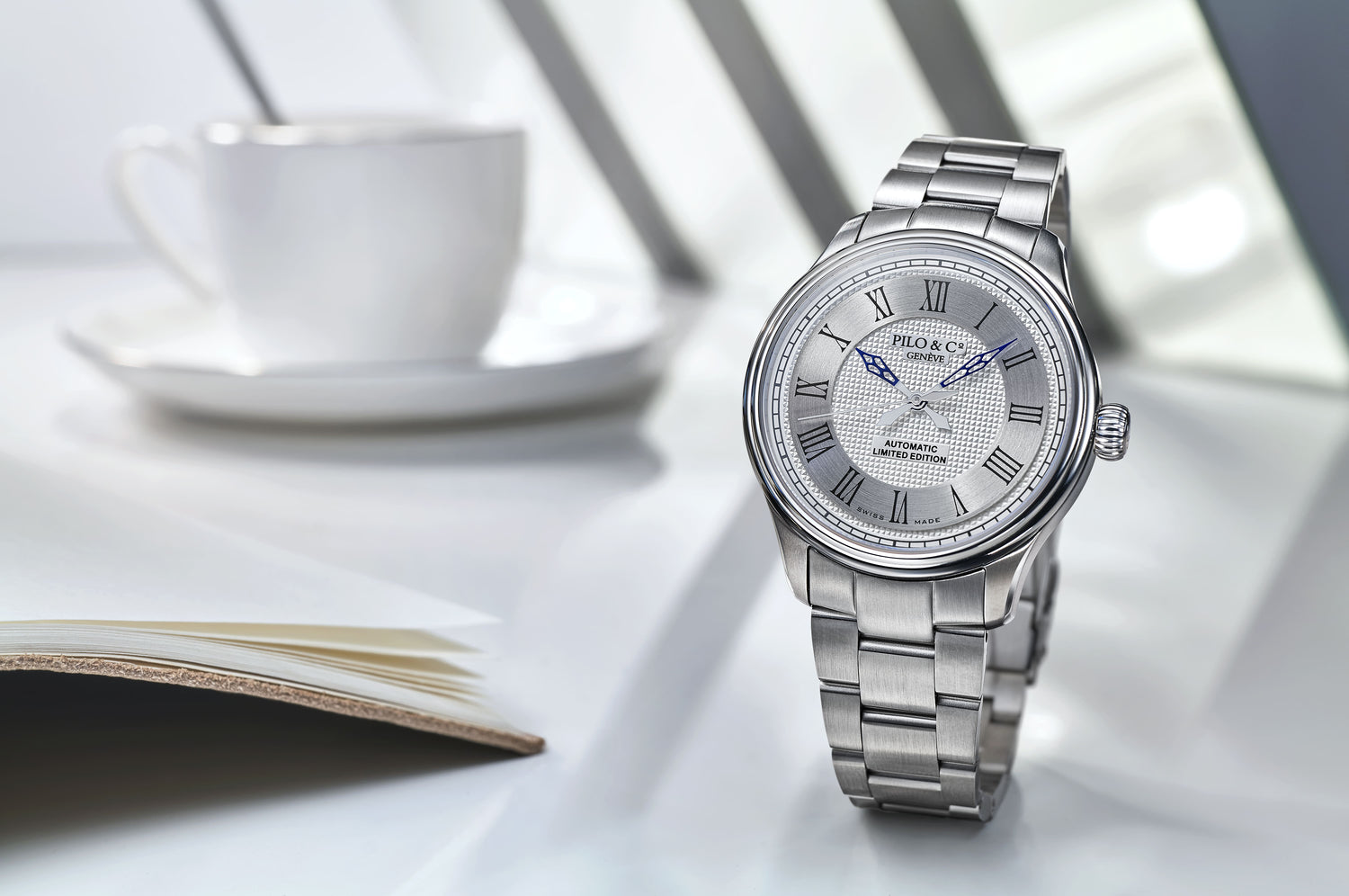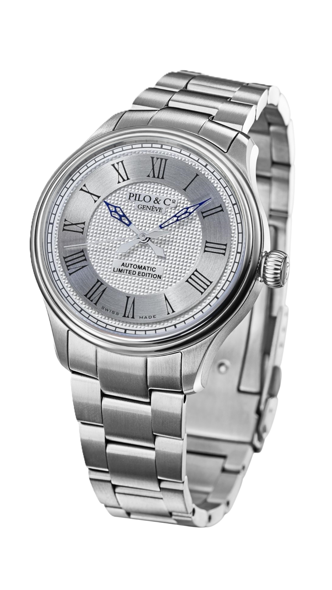 La signature « Pilo & Co Genève » et la mention « Automatic Limited Edition » se présentent sous la forme de deux plaques miniatures ornant la face interne du cadran. Elles contrastent avec le guillochage « clou de Paris », lui-même encadré par un réhaut ajouré ponctué de chiffres romains. Un second double cercle accentue l'effet tridimensionnel de l'Extraneō et les reliefs du cadran. Ce nouveau garde-temps incarne ainsi le souci du détail typiquement helvétique et un profond respect pour l'horlogerie suisse classique, particulièrement perceptible dans la méthode traditionnelle d'emboîtage, cadran vers le haut, employée pour le calibre.
