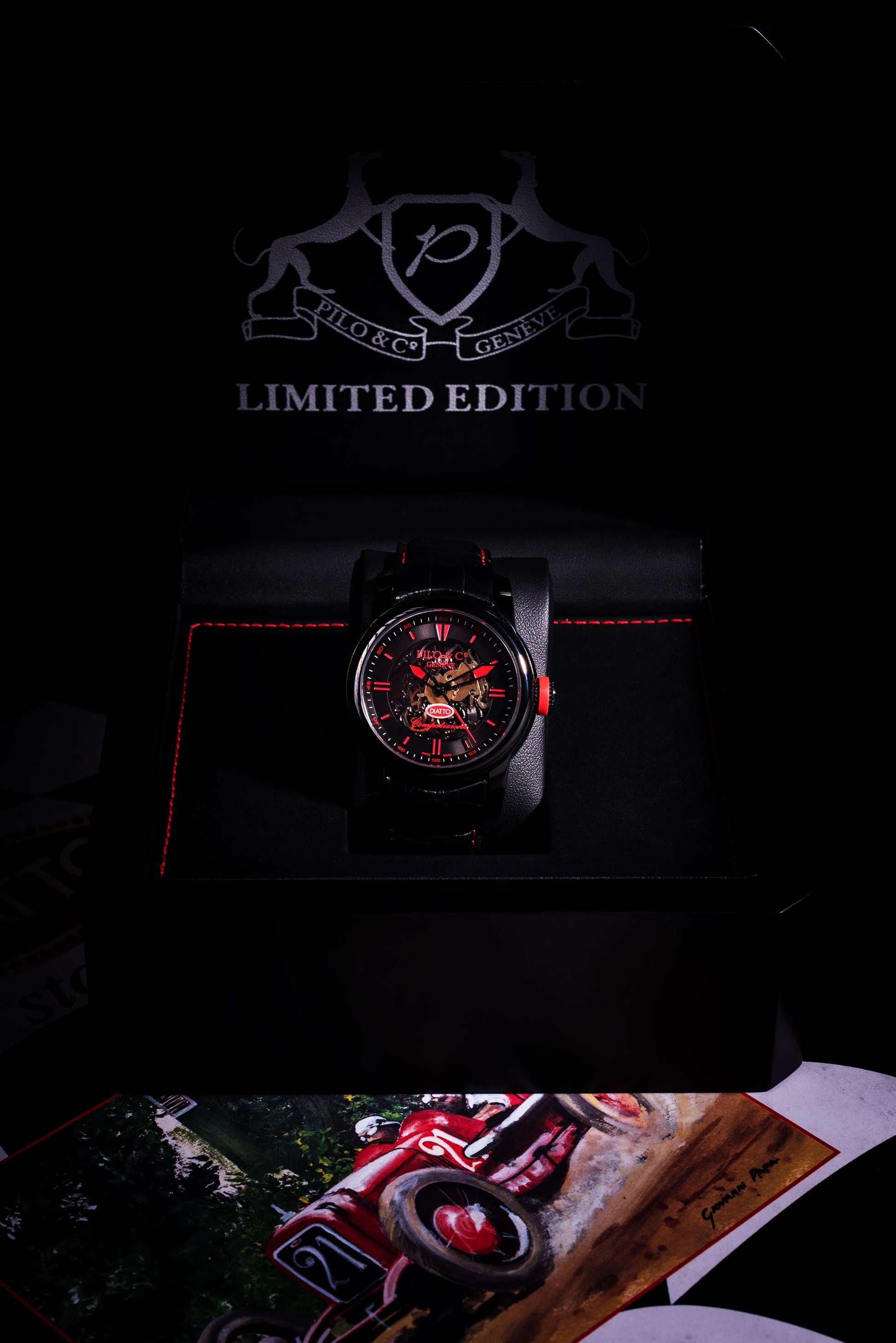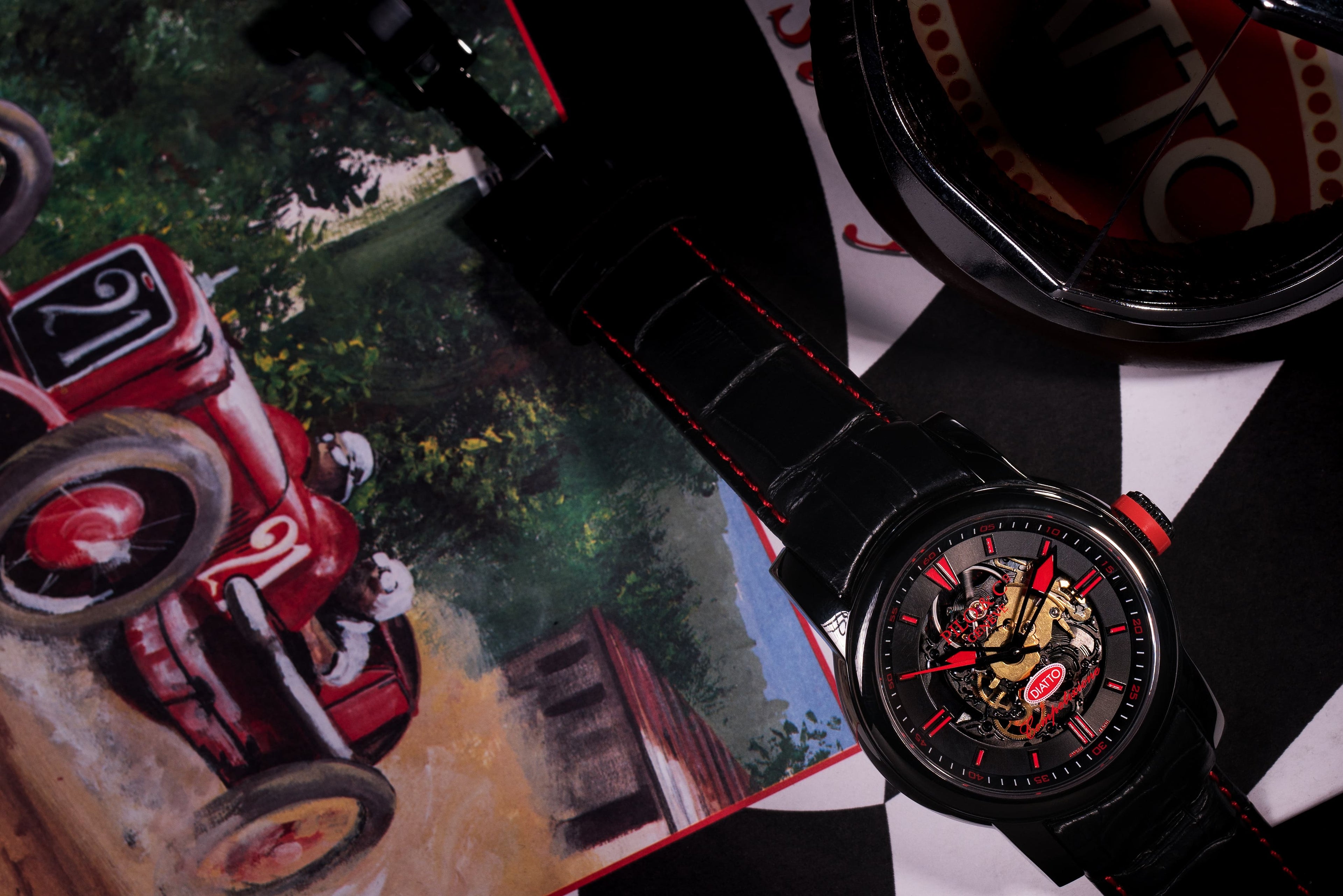 Limitée à seulement 111 exemplaires dans le monde, la Diatto Competizione rend hommage aux frères Diatto et à leur illustre héritage dans l'histoire automobile. Arborant fièrement le rouge et le noir, cette montre squelette de fabrication suisse incarne l'esprit de vitesse, d'élégance et d'innovation qui a fait des voitures Diatto des légendes du monde automobile classique.