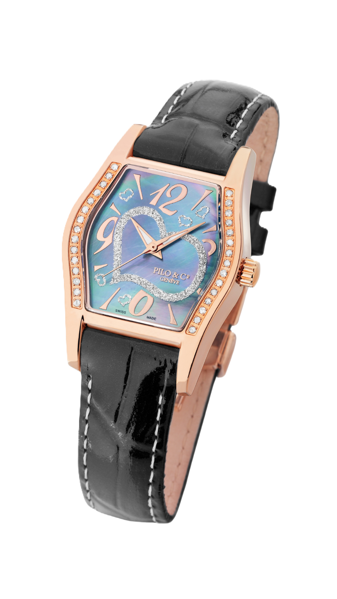 The Allegra’s solid caseback is engraved with the Pilo & Co Genève emblem , two greyhounds guarding the house’s crest, a nod to our heritage and Swiss tradition. Markings include the model reference, water resistance (3 ATM), and "Swiss Made"