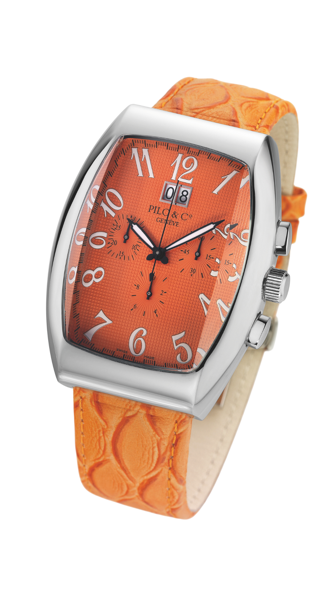 Arabic numerals that stretch slightly along the curve of the case, enhancing the sense of speed and style. Three subdials offer stopwatch functionality, hours, minutes, and small seconds, while a prominent double-window date display sits just below the 12 o’clock mark, giving the piece both symmetry and functionality.