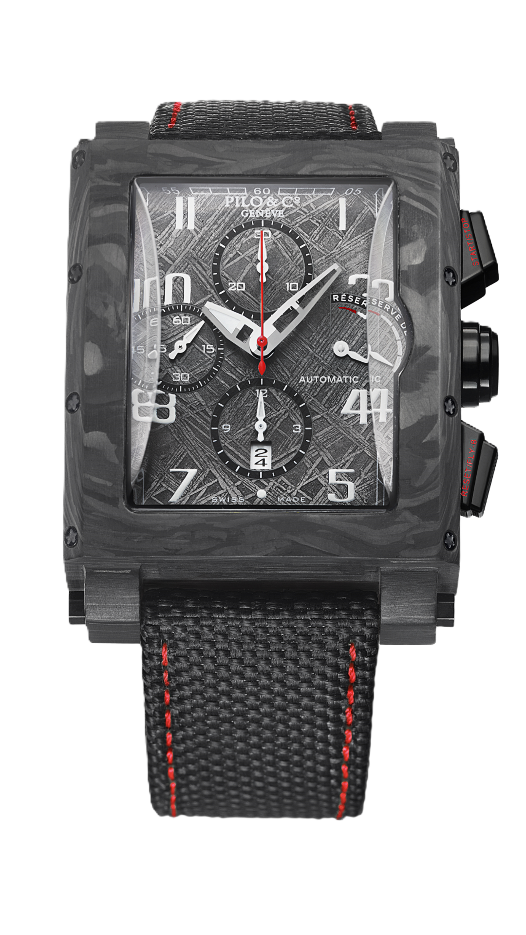 Corleone Evoluzione Superleggera, forged carbon case, meteorite dial, automatic chronograph movement with power reserve. A unique piece, enhanced by a domed and beveled sapphire crystal. Dive into the exclusivity and power of this exceptional watch.