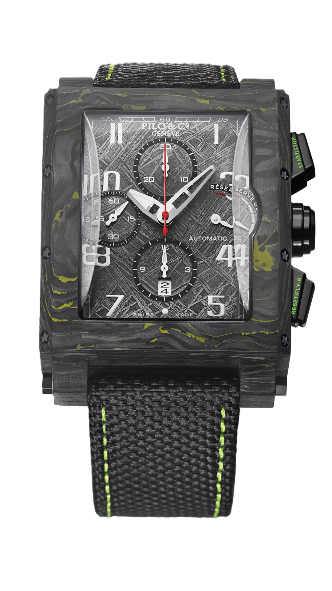 Corleone Evoluzione Superleggera, forged carbon case, meteorite dial, automatic chronograph movement with power reserve. A unique piece, enhanced by a domed and beveled sapphire crystal. Dive into the exclusivity and power of this exceptional watch.