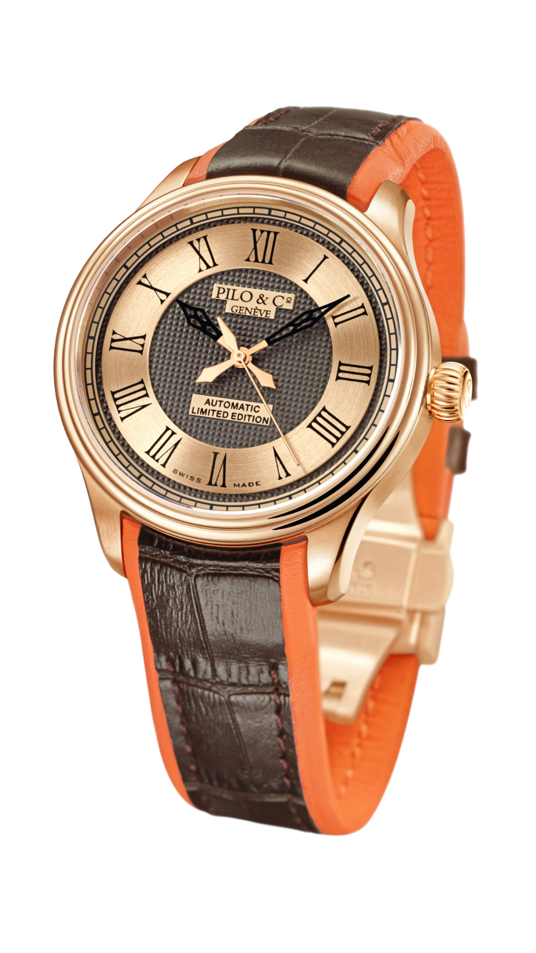 The “Pilo & Co Genève” brand signature and “Automatic Limited Edition” labels take the form of two miniature plaques adorning the innermost surface of the dial. They stand proud of the clou de Paris guilloché decoration, itself framed by a hollow-centred hour ring punctuated with Roman numeral markers. A second double-circle enhances the three-dimensional effect of the Extraneō and the dial’s reliefs. The newest timekeeper thus embodies the intrinsically Helvetian eye for good measure and a wholesome respect for classic Swiss watchmaking, especially noticeable in the traditional dial-up casing method employed for the caliber.
