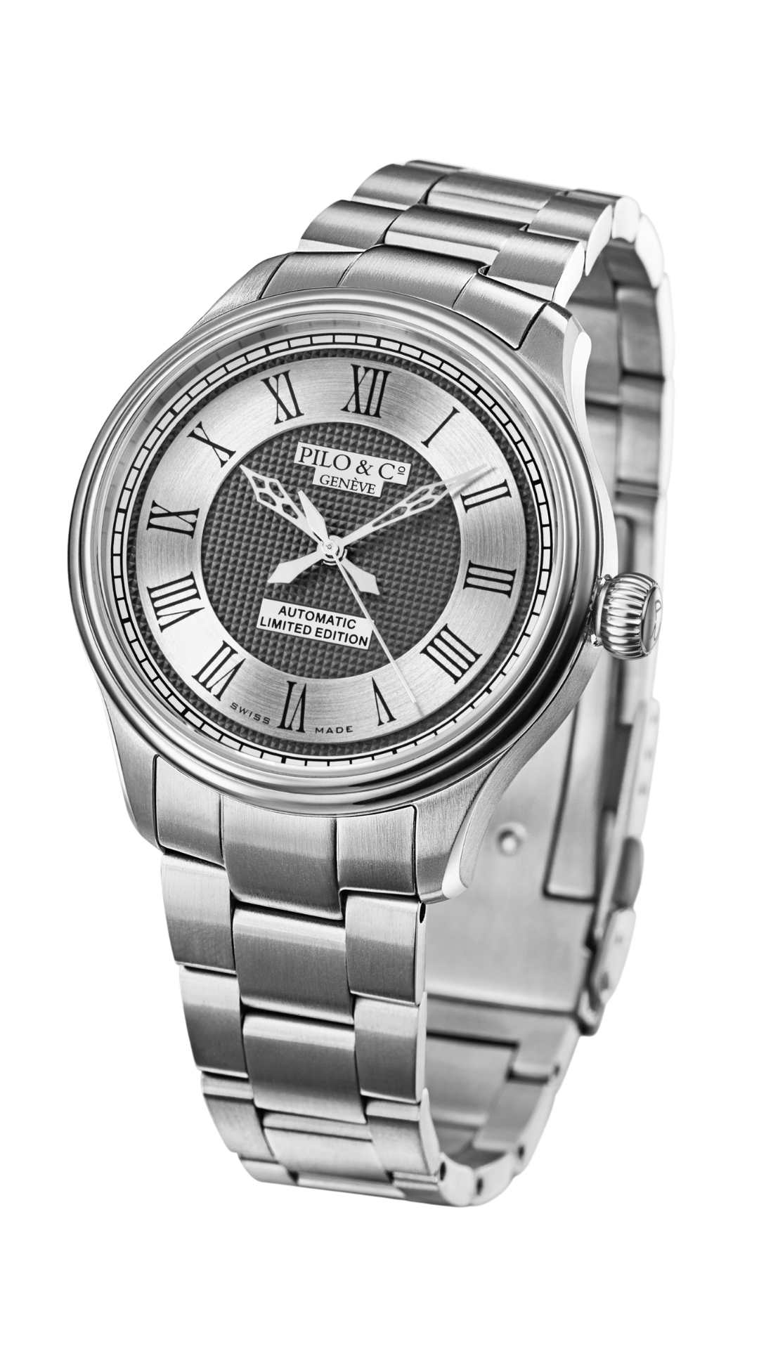 The “Pilo & Co Genève” brand signature and “Automatic Limited Edition” labels take the form of two miniature plaques adorning the innermost surface of the dial. They stand proud of the clou de Paris guilloché decoration, itself framed by a hollow-centred hour ring punctuated with Roman numeral markers. A second double-circle enhances the three-dimensional effect of the Extraneō and the dial’s reliefs. The newest timekeeper thus embodies the intrinsically Helvetian eye for good measure and a wholesome respect for classic Swiss watchmaking, especially noticeable in the traditional dial-up casing method employed for the caliber.