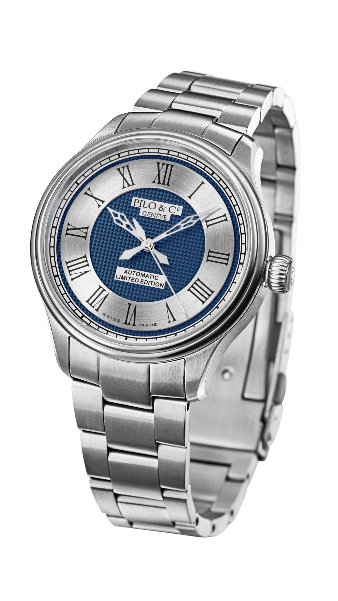 The “Pilo & Co Genève” brand signature and “Automatic Limited Edition” labels take the form of two miniature plaques adorning the innermost surface of the dial. They stand proud of the clou de Paris guilloché decoration, itself framed by a hollow-centred hour ring punctuated with Roman numeral markers. A second double-circle enhances the three-dimensional effect of the Extraneō and the dial’s reliefs. The newest timekeeper thus embodies the intrinsically Helvetian eye for good measure and a wholesome respect for classic Swiss watchmaking, especially noticeable in the traditional dial-up casing method employed for the caliber.
