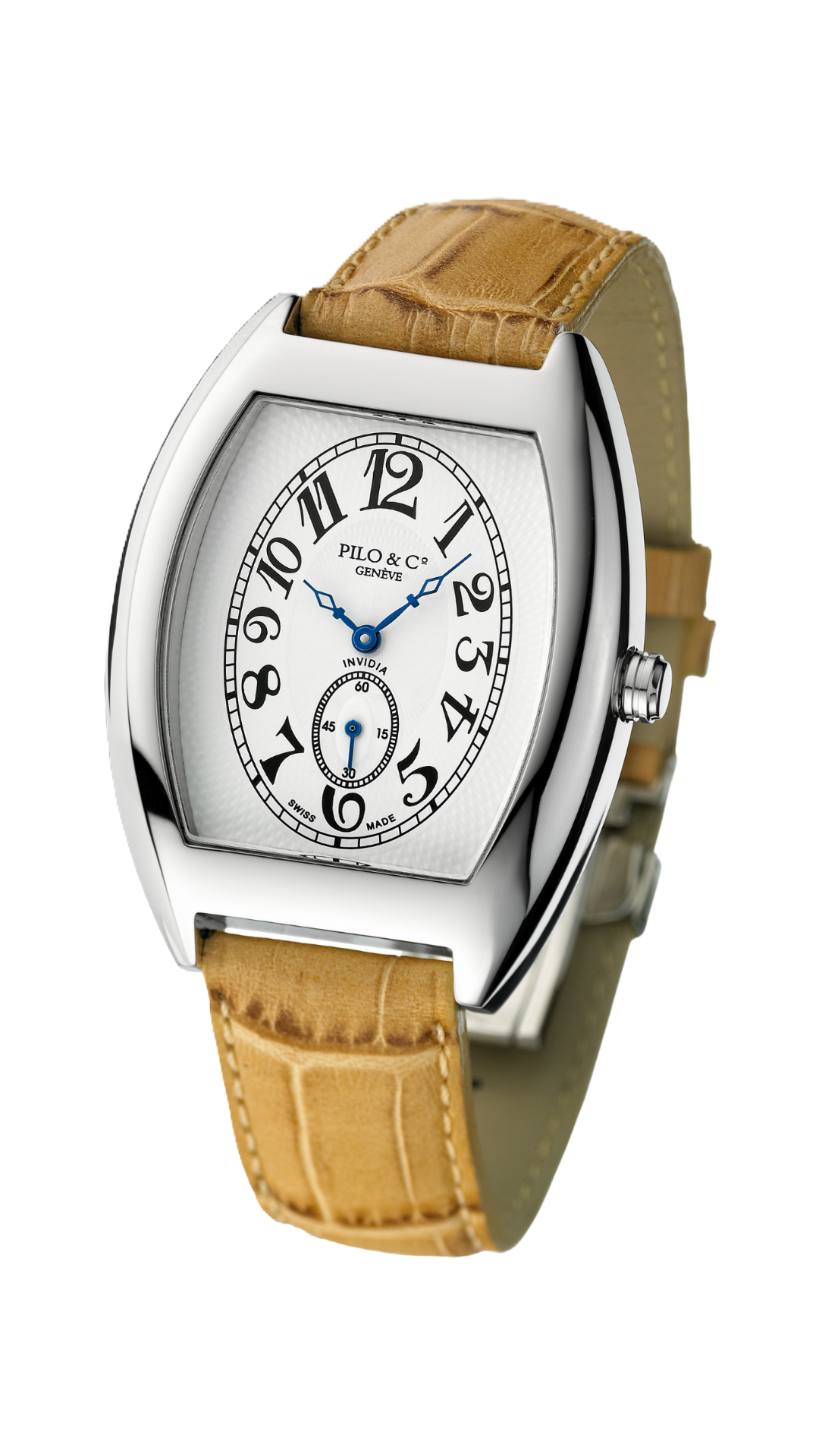 The Invidia is defined by its sculpted, curved silhouette, bold, yet refined. Its tonneau-shaped case offers a distinct presence on the wrist, with proportions that balance comfort and character. The guilloché dial, framed by stretched Arabic numerals, gives the watch its unmistakable identity. Each color: Black, Blue,White, or Pink, brings a different attitude to the same strong design.