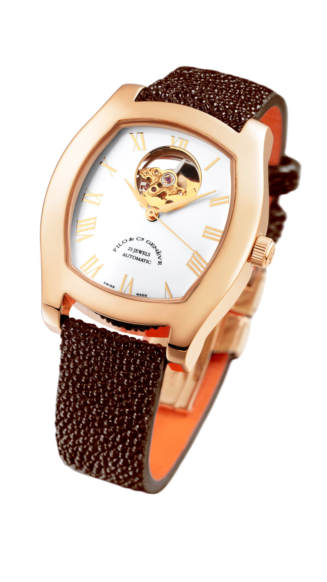 This refined automatic watch from Pilo & Co Genève features a polished case measuring 35 by 42 mm with a slim 8.7 mm profile, perfectly balancing sophistication and wearability. Its clean white ceramic dial offers a timeless aesthetic, enhanced by classic Roman numerals that lend an air of understated luxury.