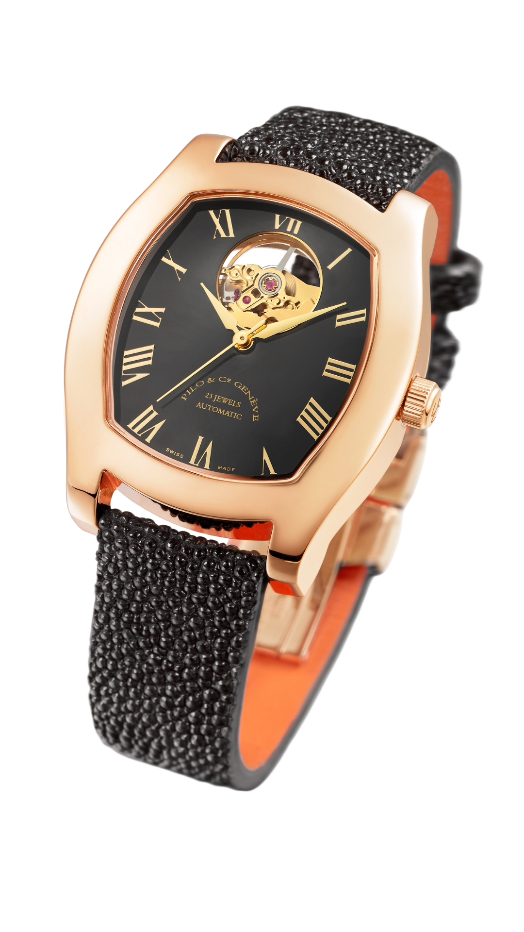 This refined automatic watch from Pilo & Co Genève features a polished case measuring 35 by 42 mm with a slim 8.7 mm profile, perfectly balancing sophistication and wearability. Its clean white ceramic dial offers a timeless aesthetic, enhanced by classic Roman numerals that lend an air of understated luxury.