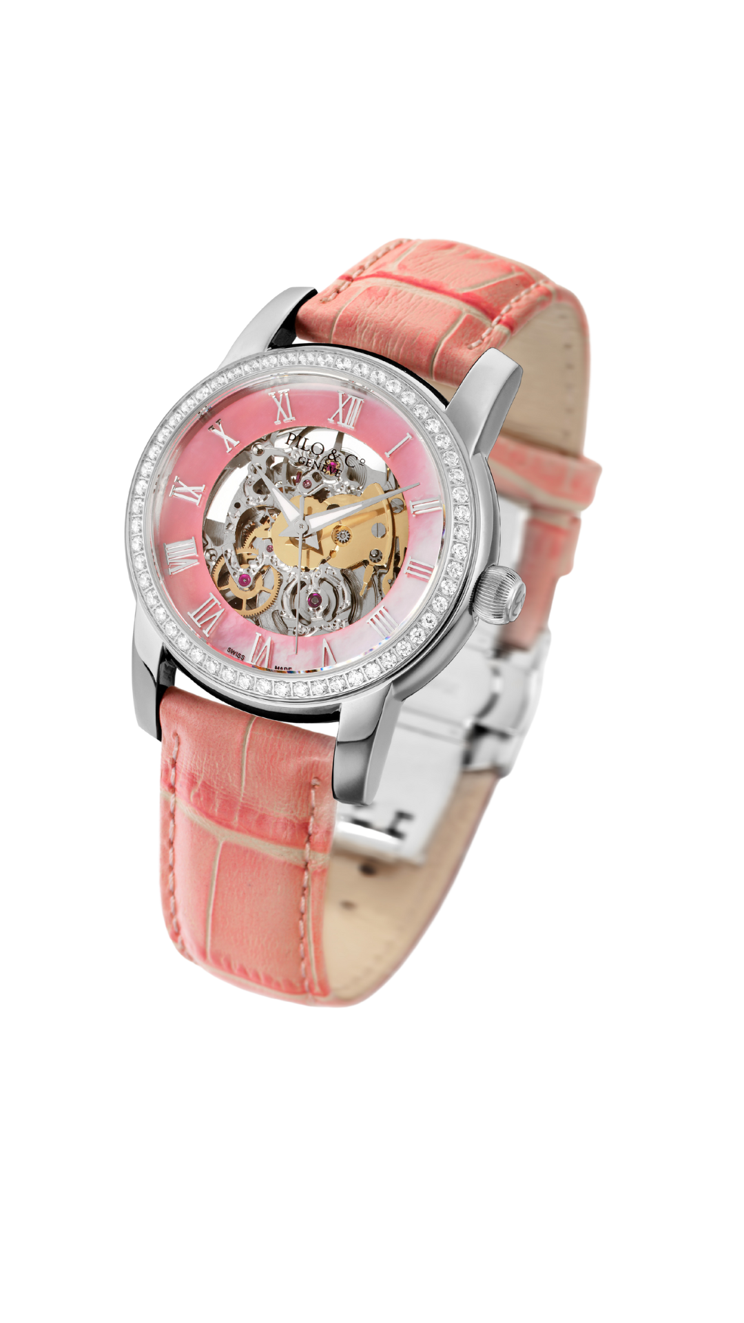 Encircled by a 38 mm steel case, crowned with a bezel set with 50 scintillating stones, theTempo Skeleton Dameis offered in bold chromatic harmonies: vivid blue, delicate pink, luminous white, or the warm radiance of pink gold PVD. Subtle touches of Luminova capture the day’s last light, allowing the watch to glow into the night. Completed by a supple leather strap and deployant buckle, it is as pleasurable to wear as it is to admire.