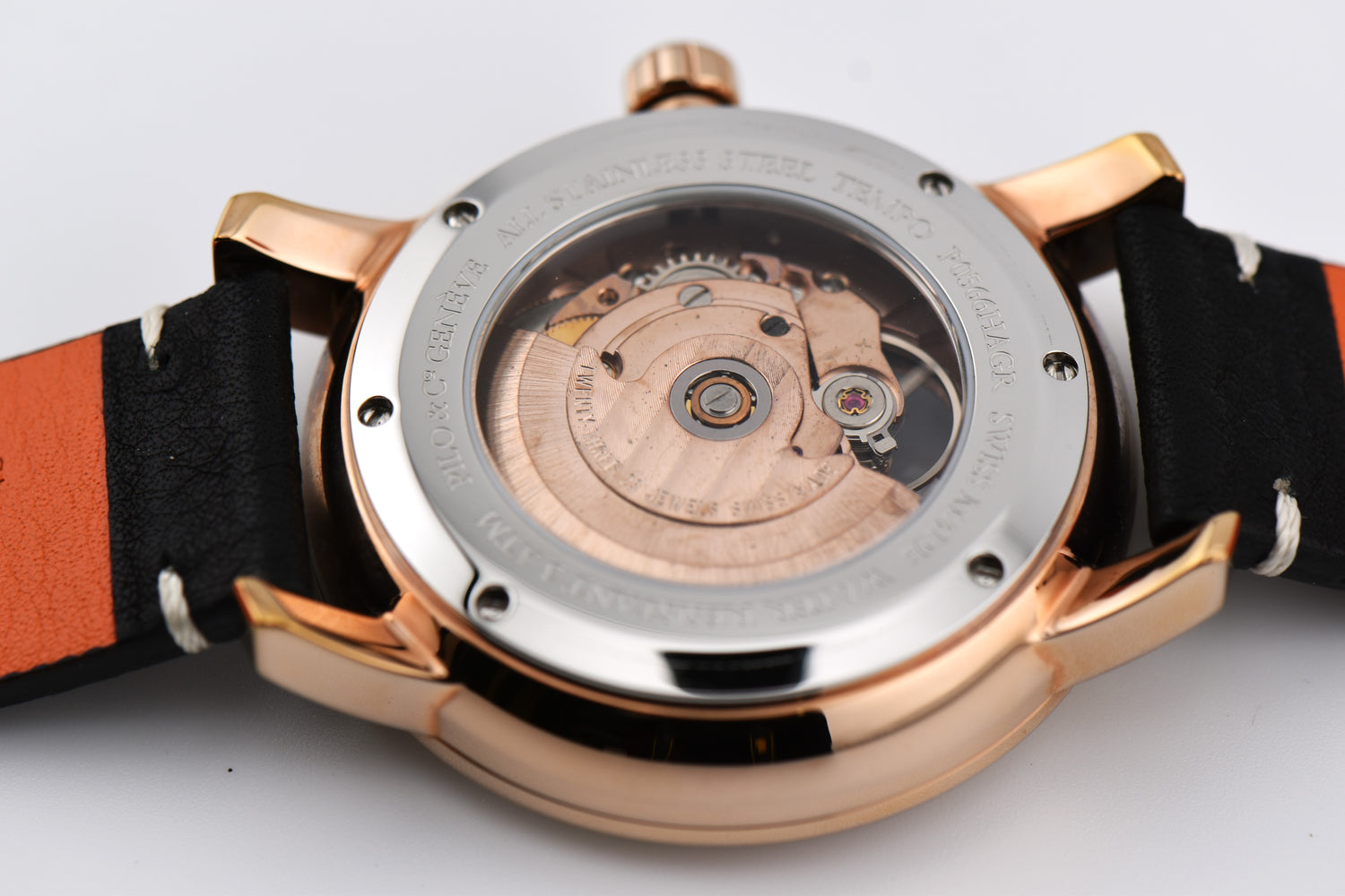 Every glance at the Tempo is a reminder of the fine mechanics within. It is powered by a Swiss automatic movement with 25 jewels, each component meticulously hand-decorated.With an open case back and visible movement, this timepiece offers a full view of its inner workings a feature true enthusiasts will appreciate.